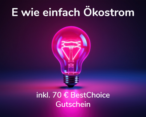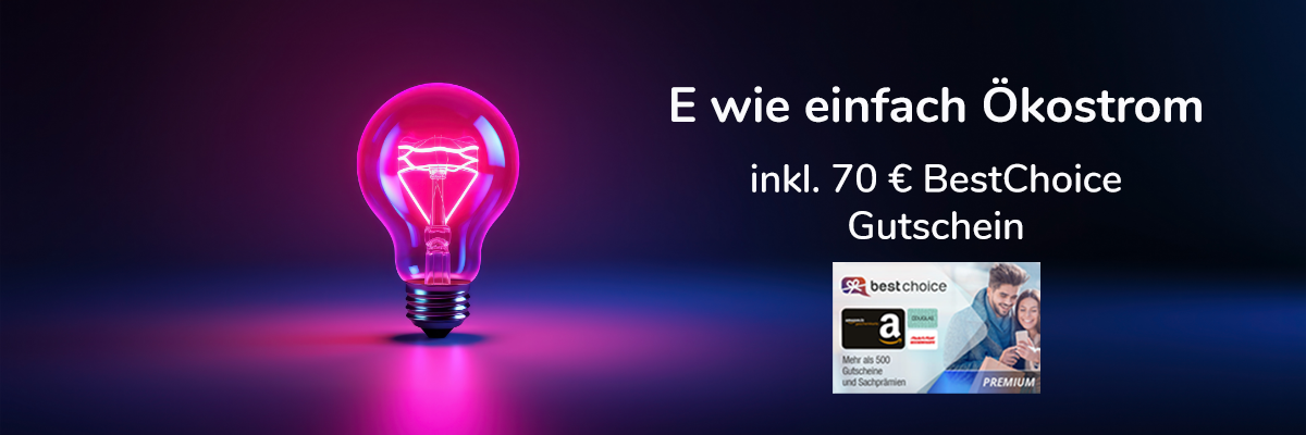 70 € BestChoice Gutschein für den Abschluss eines E wie einfach Ökostrom Tarifes mit einer Laufzeit von 24 Monaten